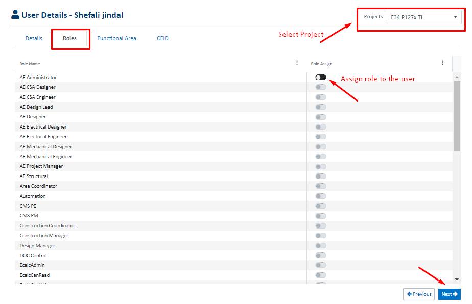 Then, click Next and Role section will appear. Here to assign user role within the project, select the project in the dropdown and assign/un-assign user roles through the toggle button. Then click next until close.