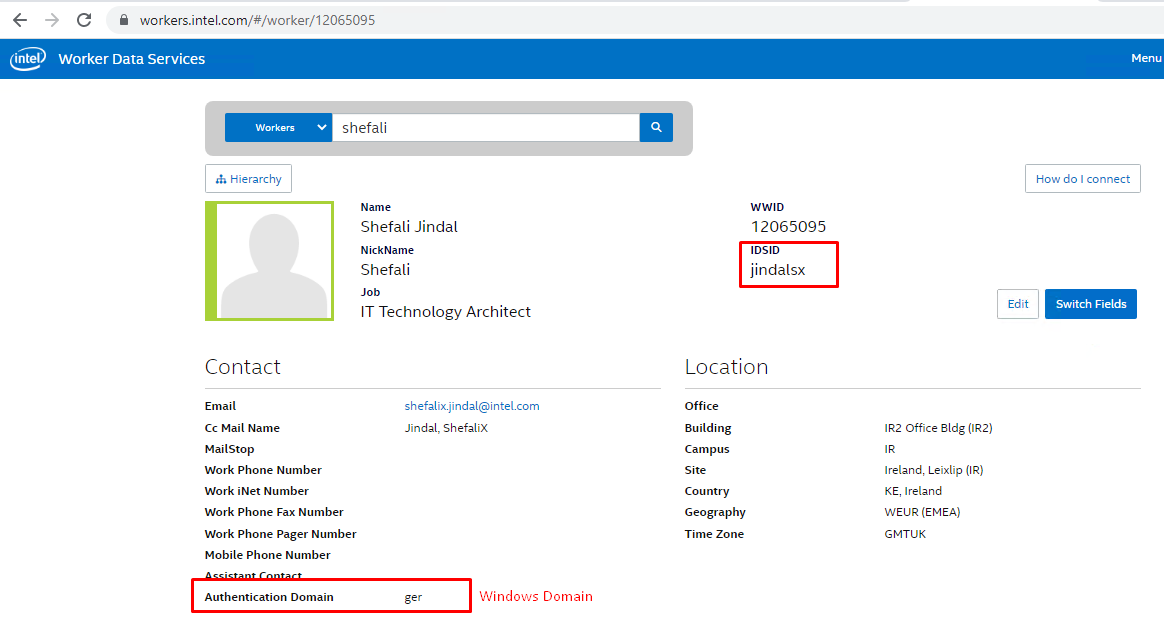 If user email is @intel and you have checked “Is Internal” checkbox, two fields will display. Windows Domain Name and IDSID auto-populates. However if it did not auto-populate you can add it manually through these steps: 1. navigate to workers.intel.com . 2. search the user. Once on user profile look for IDISID and Authentication Domain (Windows Domain Name) . Note: If user email is external (not @intel), Windows Domain and IDSID will auto-populate. You can then skip this step.