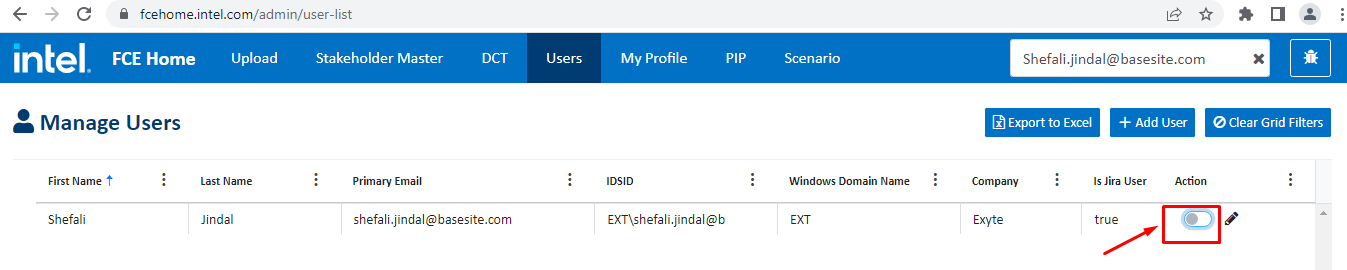 4. Then, deactivate user by clicking on the toggle button to the left under the “Action” column.