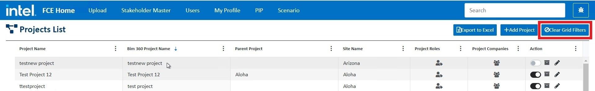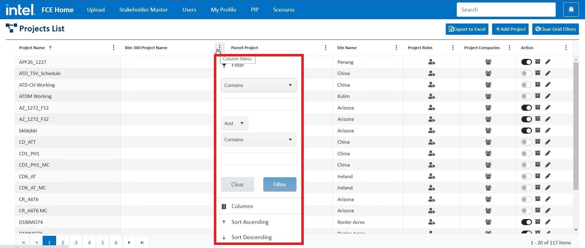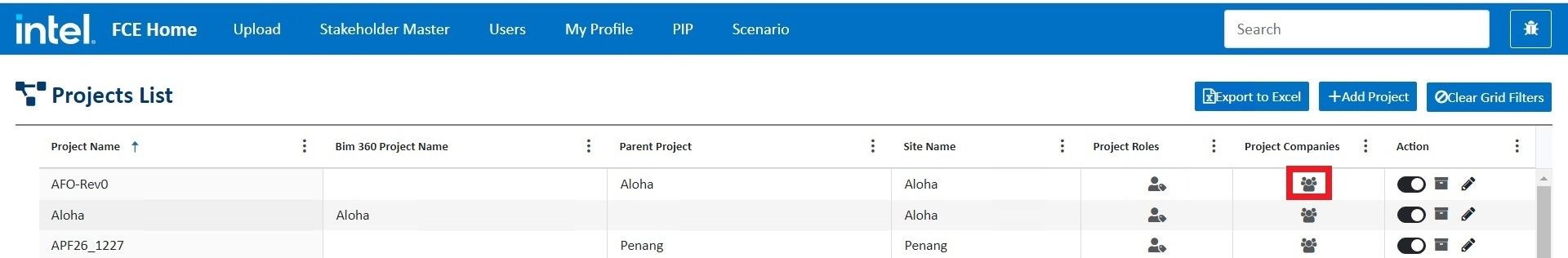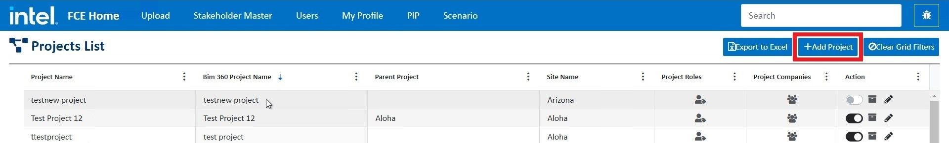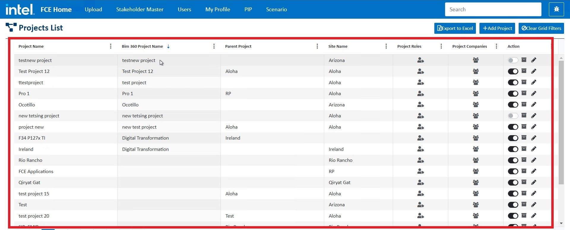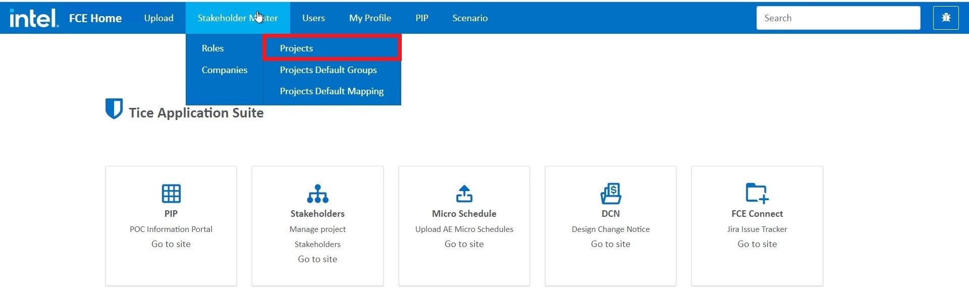 Log into fcehome.intel.com and navigate to the Stakeholder Master from the top. Hovering the Stakeholder Master opens a sub-menu; click Projects from the sub-menu. It redirects to the Project List page.