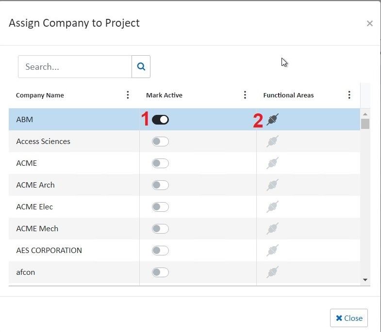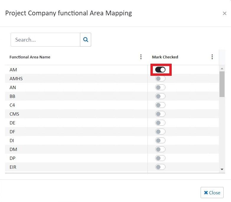 Upon clicking the functional area icon, a project company functional area mapping page opens. Toggle on the corresponding button of any functional area you want to activate for the company.