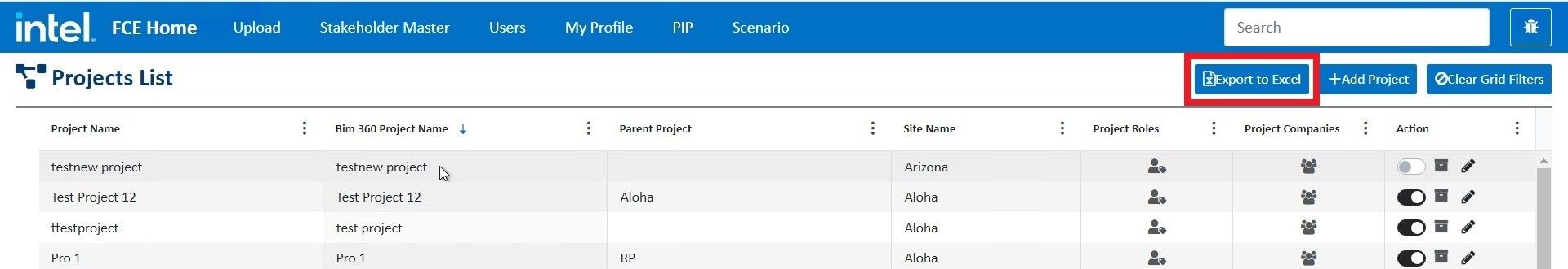 Click Export To Excel to download the excel file of all the project details that are currently being displayed in the project grid based on the filters applied.