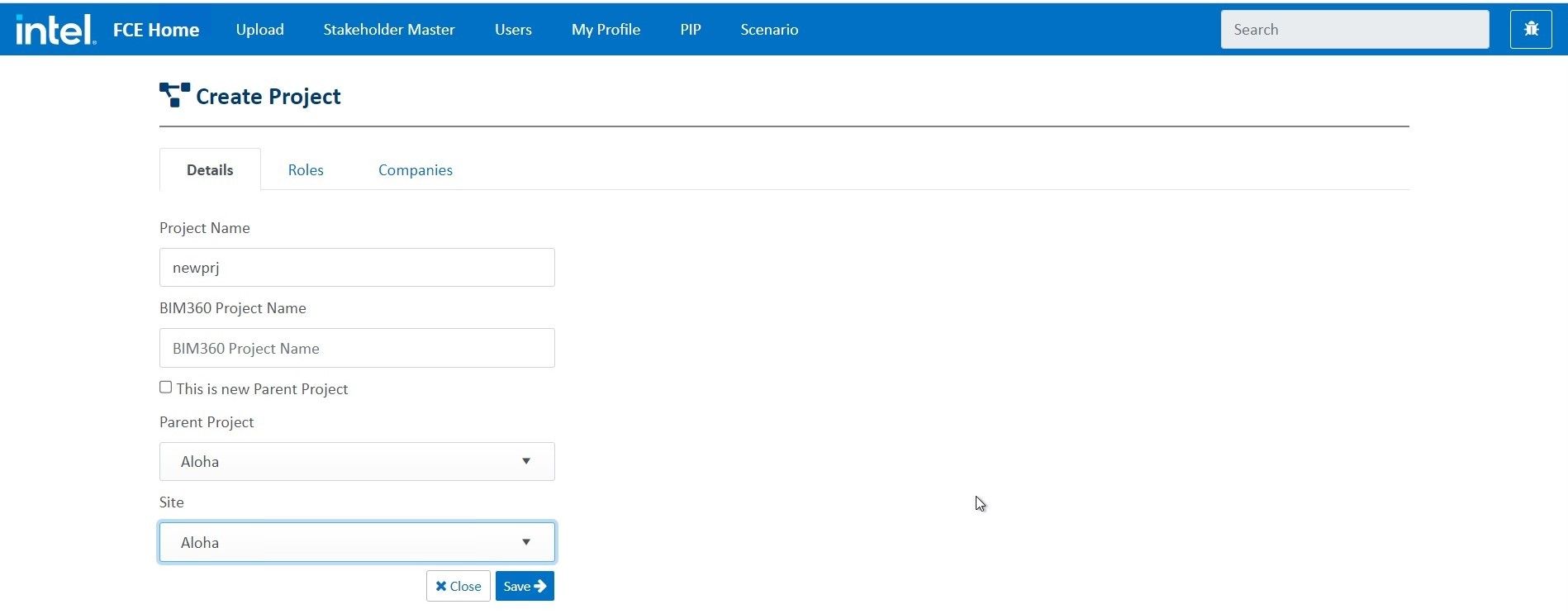 Upon clicking the Add Project button, a new modal window opens consisting of three tabs: Details, Roles, and Companies. You can enter the data in all three tabs and save it to create a new project. The new project will display on the project list page.