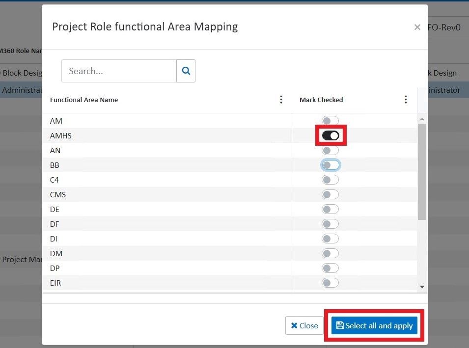Upon clicking the functional area mapping icon, you are navigated to the Project Role Functional Area Mapping page. You can activate any functional area here by toggling on the corresponding button or to activate all the functional areas in the list for the role, click Select all and apply from the bottom right corner of the age.
