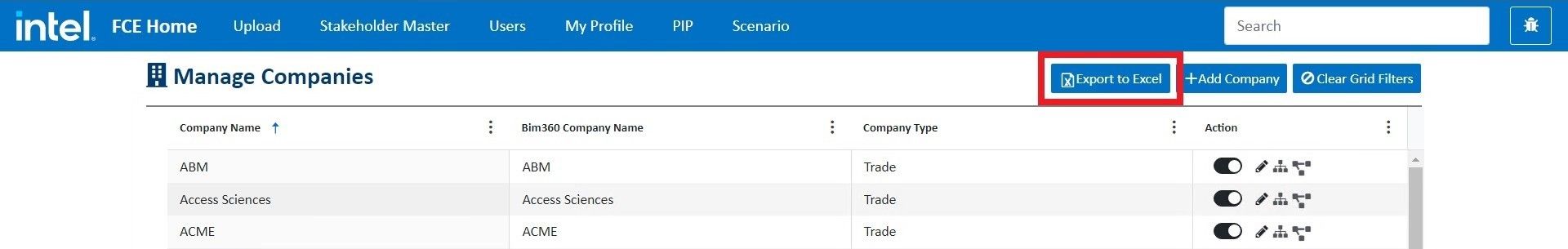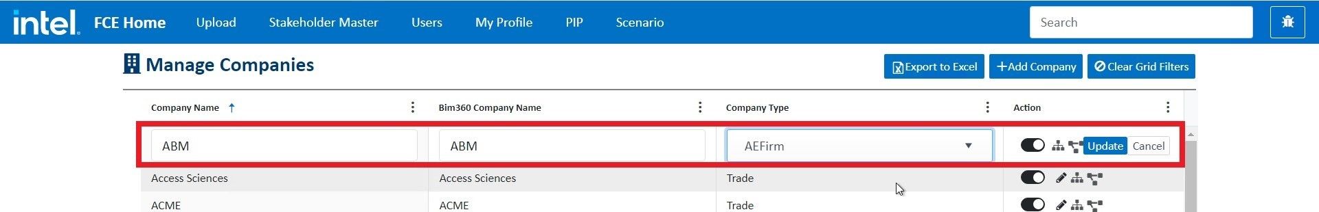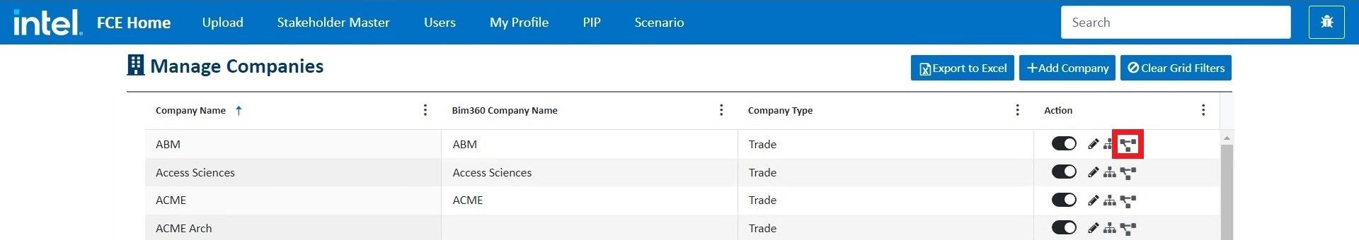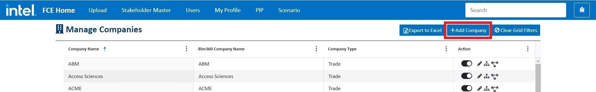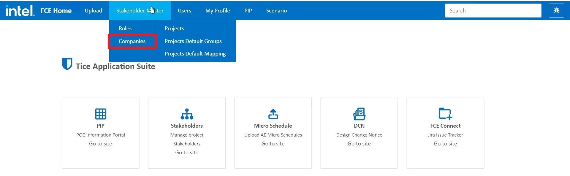 Log into fcehome.intel.com and navigate to the Stakeholder Master from the top. Hovering the Stakeholder Master opens a sub-menu; click Companies from the sub-menu. It redirects to the Manage Companies page.