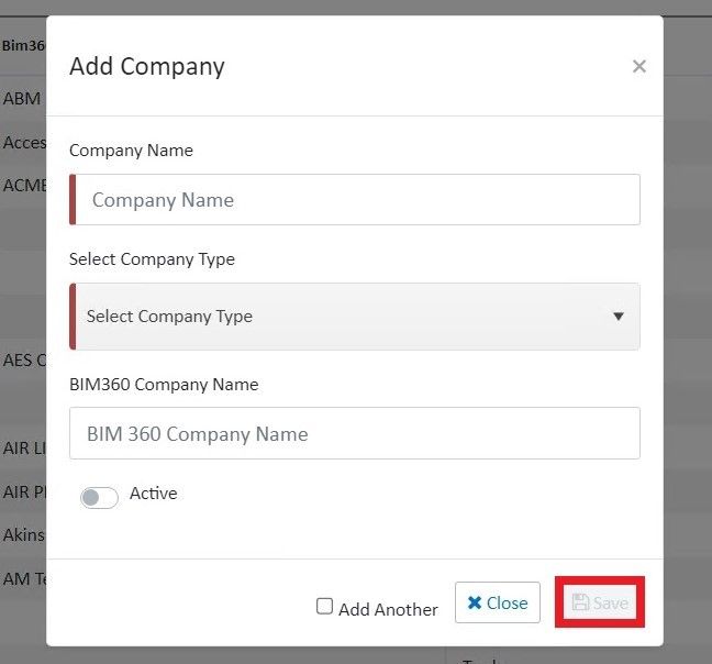 , a new modal window opens. You enter the company details such as company name, company type, BIM 360 company name, and click Save to add the new company.