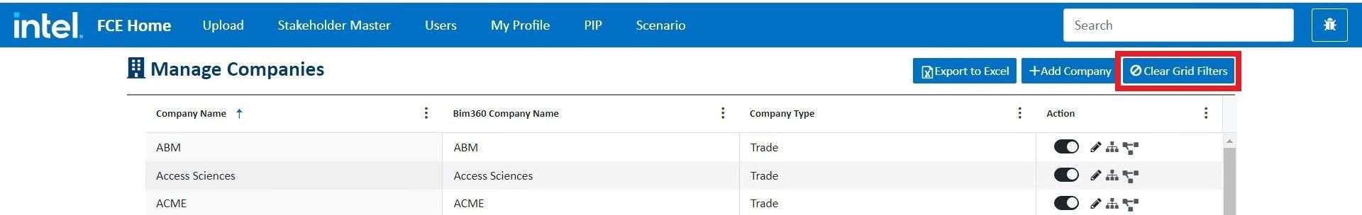 Toggle on the button in the company grid to make the company active. It means the active companies can be assigned to projects further and will display on the update stakeholder page as well.