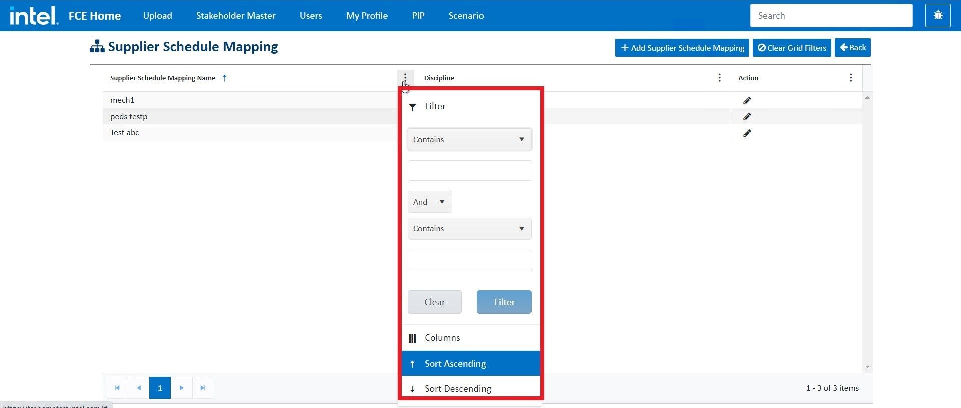 For example, you can filter the values for Supplier Schedule Mapping Name in the grid by clicking on the adjacent vertical ellipsis and specifying the filter condition such as Contains the selected process to filter the data.