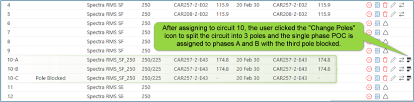 Single phase POCs on distribution boards | When a user assigns a single phase POC with two hots to a distribution board, they may want to select which of the two poles on the breaker that the POC should be connected to. A new feature has been added to Powerup to allow the user to select which of the poles/phases that the POC should be connected to. After assigning a single phase POC to a circuit on a distribution board the “Change Poles” icon will appear to the right of the circuit grid. Clicking on the icon will split the circuit on the distribution board into three individual poles for phase A, B and C. The POC will be assigned to phases A and B. Pole C will be blocked. Clicking on the “Change Poles” icon again will switch the POC to phases B and C, with phase A blocked. Clicking the “Change Poles” icon the third time will move the POC to phases A and C with phase B blocked. If the user deletes the assignment, then the circuit on the distribution board will return to its original state as a single three phase circuit. ![]() In the image above, the user can see that circuit 10 has been split into 3 as the phase of the 3 poles on circuit 10 is shown and the “Change Poles” icon is visible on the right. The icon will not appear for 3-phase POCs. As the user changes the poles that the single phase POC is connected to, the table showing phase balance will update accordingly. See also next item. |
