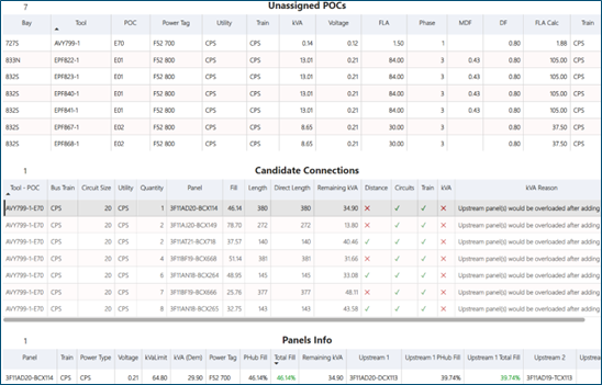 Optimize Manual Assignments | A new feature has been added to PowerHub to optimise the process of manually assigning power POCs to panels. With this feature users get the ability to select a panel that will be able to handle the load of a group of similar POCs on a tool. It also allows faster POC assignments for groups of similar POCs. “Assign multiple similar POCs” button On the PowerHub home page, there is a new button between the assign and edit buttons. Clicking on this button will find the POCs that have the same utility supply type, train, power tag, voltage requirement, and either high or low amperage and group them together for assigning. ![]() Calculate combined load on panel and upstream panels When the panel selection page appears, all the similar POCs are displayed on the right-hand side. The panel dropdown will list all the suitable panels and will display the distance from each panel to the furthest of the included POCs. The load calculations for the bottleneck panel will include the effect of assigning all the similar POCs to the selected panel. You can decide to exclude some of the similar POC from the calculations if you need to split the similar POCs across 2 panels by checking the box above each POC’s button. If any of the similar POCs have already been assigned to a panel, they will still be listed amongst the buttons, but they will be excluded from the calculations. You can check the box above its button to include it. ![]() One POC is always in focus When the user clicks the “Assign multiple similar POCs” button on the home page beside a specific POC, then that POC will be the one that is in focus on the panel selection page. The in-focus POC will have a white background. The details of the in-focus POC are displayed above the POC buttons. Clicking on a POC button will set it to be the one in focus. The Roxtec and Level dropdowns only affect the in-focus POC. Roxtec assignment and setting POC level For sites that use Roxtecs, the separate Roxtec assignment window has been removed and Roxtec assignment now happens on the same page as panel assignment. The Roxtec and Level dropdowns will appear above the panel dropdown. Selecting a value for Level or Roxtec will only affect the POC whose button is currently in focus. Assigning a Roxtec or setting a POC’s level will cause the calculations to be rerun which may result in updates to the distances shown beside panels in the dropdown. Power Tag assignment The power tag dropdown is beside the level dropdown. Selecting a new value for Power Tag will assign that value to all the similar POCs. This will cause the generation of a new list of suitable panels that match the chosen power tag. Multiple POC assignment Once a suitable panel that can take the load of all the similar POCs has been selected, the user can then proceed to assign all those POCs to the panel. As you click on the assign icon beside a circuit in the grid, the POC currently in focus will be assigned and the next of the similar POCs will come into focus. The user can just keep clicking on circuits to assign all the included POCs to the panel. Any of the similar POCs that are excluded will be skipped during the assignment process. |