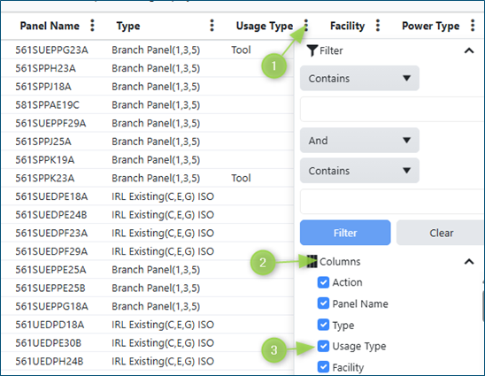Panels: Usage type | A new field, “Usage Type” has been added to power panels. It has values of “Tool” or “Facility”. It is an optional field and is blank by default. It can be set in the edit panel page. When assigning POCs, Usage Type is displayed in the panel selection dropdown. ![]() The “Usage Type” field is shown on the Flash scenario panels page, so users can now filter out facility-only panels. The “Usage Type” field can be displayed in the panel list; it is hidden by default. To display the new field, click on the 3 dots beside any column header, click on “Columns” and check the field in the list. ![]() The new field can also be set when bulk importing panels. |