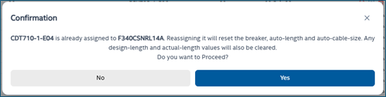 Warning messages during assignment | This change was required to enable the optimise manual assignments functionality. Previously, when a POC was assigned to a panel and the user browsed to another panel, they were getting a warning as soon as they selected another panel from the dropdown. Now, this warning is displayed only when the user actually attempts to assign the POC to another circuit. ![]() The warning described above, and the warnings listed below have been reformatted to be displayed in dialog boxes like the one shown above. Note all of these are preexisting functionality. • If user selects a circuit with a frame size which is too small for the POC the message “Please select a breaker with a larger frame size” is displayed • If a user selects a circuit with an existing assignment, the message “You can't assign to a circuit with an existing future assignment” is displayed • If a POC is locked, the message “POC is currently Locked. Proceeding will unlock the POC” is displayed • If the panel of the chosen circuit is locked, the message “This Panel has been locked due to capacity issues. You need to have approval from CS before proceeding” is displayed |